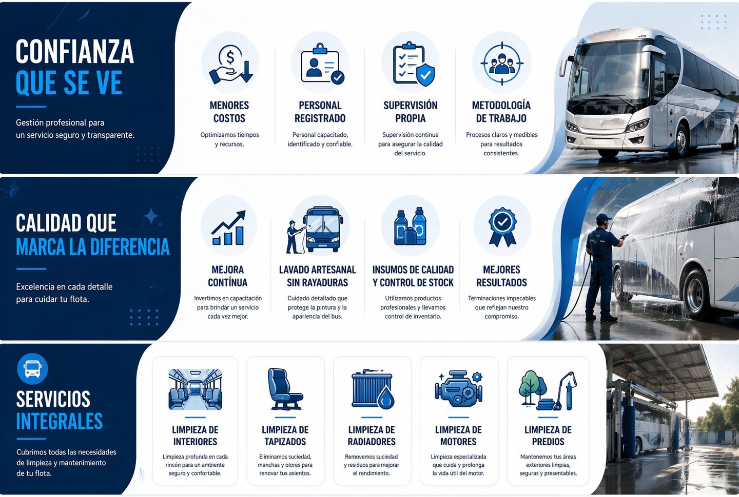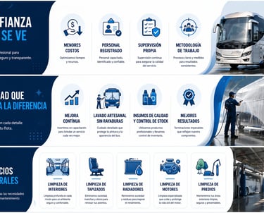 Somos una empresa dedicada a la limpieza de Buses urbanos, media y larga distancia, Camiones y Predios con profesionalismo y eficiencia